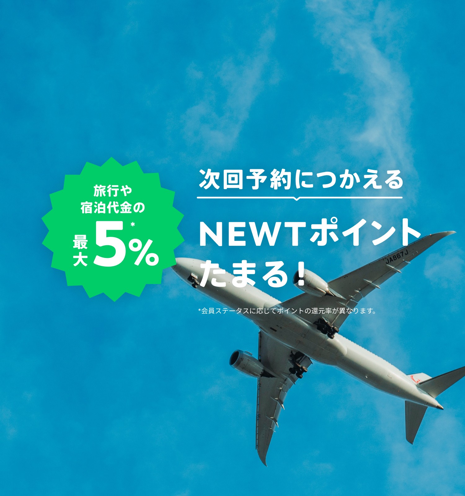 NEWTで予約した「旅行・宿泊代金の最大5%分」のポイントがたまります。ツアー帰国日(宿・ホテル予約の場合はチェックアウト日)の翌月7日がポイント付与日です。