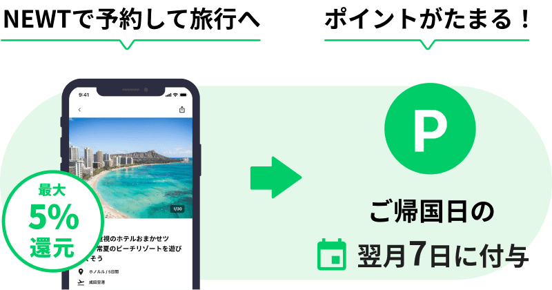 NEWT(ニュート)では、海外ツアーや宿・ホテル予約料金の最大5%分*のポイントを還元!1ポイント=1円として次回の旅行予約で使えます。